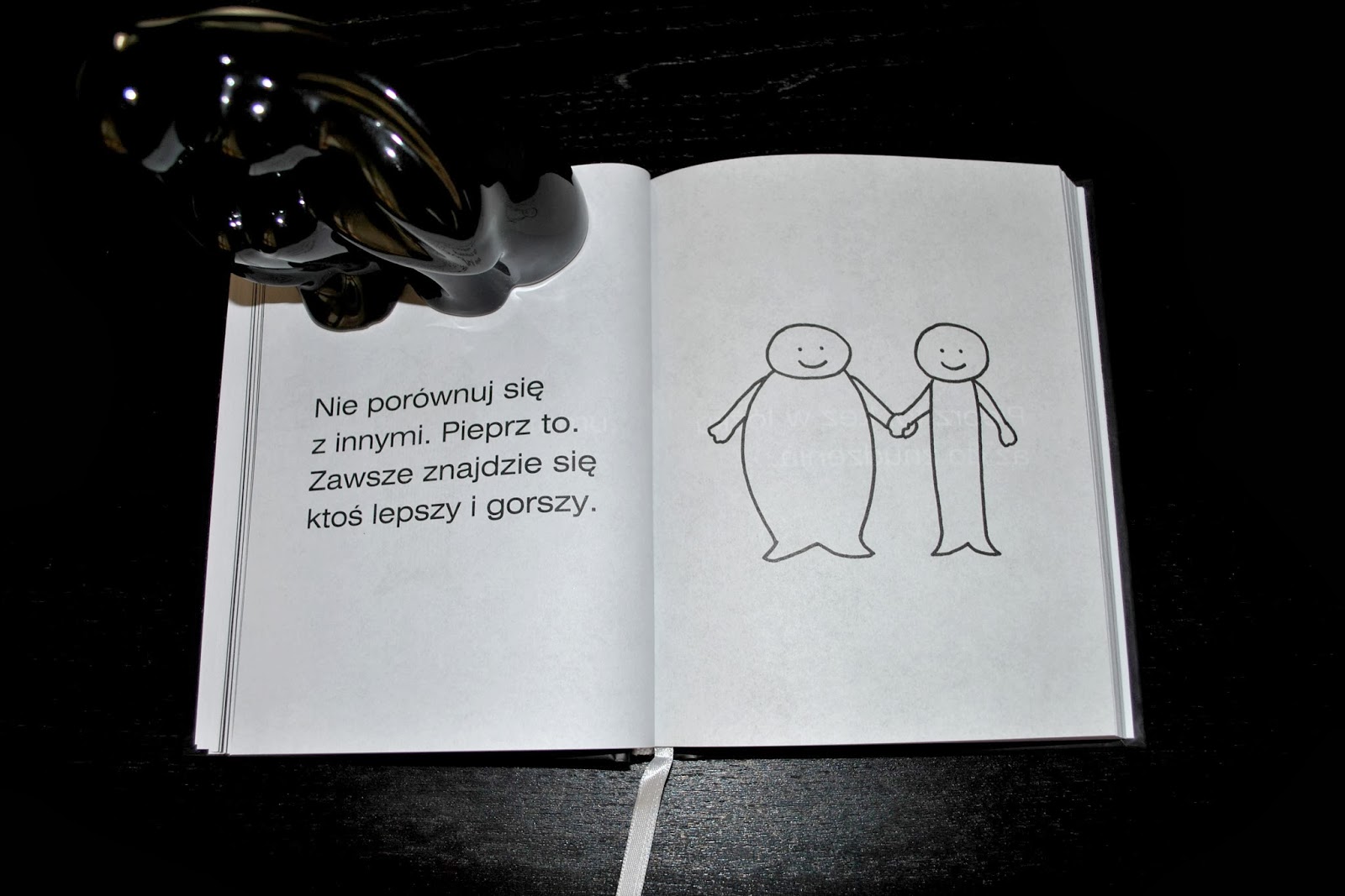 Czytając dalej dowiemy się, jak rozwalić mury swojego więzienia, czyli jak umiejętnie wszystko olać. Warto uświadomić sobie także, że nie musi chodzić tylko o to, by dać sobie z czymś spokój i zwolnić tempo, ale także zmobilizować się i ruszyć do działania. Powiedzieć wszystkim PIEPRZĘ TO i sięgnąć po coś, czego się pragnie. Jak mówi sam autor ta sentencja pomaga przywrócić równowagę w życiu, niezależnie od tego, z której strony się znajdujemy. Myślę, że kilka wniosków możemy wyciągnąć z historii Marka, którego nazwisko i tak was nie zainteresuje. Ten mężczyzna od najmłodszych lat marzył o kupnie najnowszego porsche. I wiecie co? Zrobił to. Powiedział "pieprzę to" i po prostu je kupił. Pożyczył na nie pieniądze i wydał wszystkie oszczędności, co można uznać za zupełny brak rozsądku, ale czy może to równać się z radością, jaka później towarzyszyła jego życiu? Człowiek spełnił swoje największe marzenie, nie patrząc, co pomyślą inni ani nie zadręczając się, z czego uda mu się później utrzymać rodzinę. Żył chwilą i cieszył się ówczesnością. Czy to nie jest piękne? Jest i być może dosyć głupie, ale chyba najbardziej oddaje sens motta "pieprzę to". Masz na coś ochotę? Działaj, nie ograniczaj się, nie przejmuj się tym, co powiedzą ludzie. Czujesz, że już nie dajesz rady? Odpuść sobie i otwarcie powiedz "nie". Świat się nie zawali, gdy nie będziesz najlepszy. Po prostu pieprz to z wysoko uniesioną głową i miej w sobie trochę dziecka, bo to jest fajne i tego właśnie chcesz!