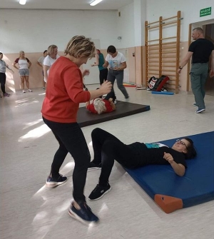 nas jakimś niebezpiecznym przedmiotem lub też spróbuje nas dusić. Muszę przyznać, że były to bardzo ciekawe i wartościowe zajecia, dlatego wypada mi tylko żałować, że zabrakło nam czasu, by dowiedzieć się, co możemy zrobić, gdy we wspomnianej powyżej sytuacji mamy na sobie elegancki strój wyjściowy - obcasy, długie kolczyki, obcisłą i krępującą ruchy sukienkę. Mam jednak wrażenie, że paniom chyba najbardziej spodobało się spotkanie z behawiorystą zwierzęcym. W końcu większość z nich ma w domu jakieś zwierzę. Dowiedziałayśmy się na tym spotkaniu, a jaki sposób kontaktować się ze swoim pupilem, by robił to, czego od niego oczekujemy, czyli by ten pies bądź też kot był nam po prostu posłuszny. Ostatnie spotkanie dotyczyło wspomnianej wcześniej pierwszej pomocy przedmedycznej.