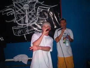 Razem z moimi znajomymi i znajomymi znajomych, którzy po chwili stali się także moimi znajomymi, ulokowaliśmy się w jednym boksie. Po chwili, w pobliżu sprzętu (dwa gramofony, głośniki i jakieś nieznane mi bliżej urządzenia) pojawił się Jupik (formacja Co.Combo) i Dj DBT. Pierwszy przeprosił zgromadzonych za obsuwę i poinformował pokrótce, przedstawiając drugiego, co się będzie działo. Przyznam, że DBT zapodał naprawdę świetną dawkę oldschoolu. Gibało się przy tym świetnie. Od razu dało się wyczuć ten specyficzny jamajski klimat panujący już do końca imprezy. Było luzacko, baunsowo, przyjacielsko, bez jakichkolwiek konfliktów. Nawet nikt się nie burzył, kiedy jeden ziomek wpadł na parkiet z pryskającym browarem. Wracając do samego Dj-a, ten pokazał, że całkiem nieźle potrafi scratchować (drapać palcami po płycie dla osiągnięcia dźwięku). Zdecydowanie na plus. Po nim mikrofon przejęła jedna z gwiazd wieczoru, czyli Junior Stress. Razem z Natty B (powiem tylko, że chciałbym mieć takiego dziadka) i wspomnianym wcześniej Jupikiem zagrali trochę naprawdę dobrego reggae i dancehall. Napięcie rosło coraz bardziej, podsycane ciągłymi zapowiedziami, że "oni" już niedługo się pojawią. I wreszcie nadszeli. Trzech (może z początku niepozornych) chłopców w czarnych koszulkach - Al-Fatnujah. Z poprzewracanych głośników szybko zbudowano "scenę" i zaczęło się. Usytuowałem się tuż przy owym scenopodobnym wyrobie, na tyle blisko, że jeszcze dwa dni później dźwięczało mi w jednym uchu. Chłopaki zapodali naprawdę mistrzowski beatbox. Nie widzę prawie żadnej różnicy między ich coverami a oryginalnymi kawałkami. "I like to move it", "Hey sexy lady", "My love" i oczywiście ich autorska "Trzecia beatwa światowa"... no po prostu mistrzostwo.