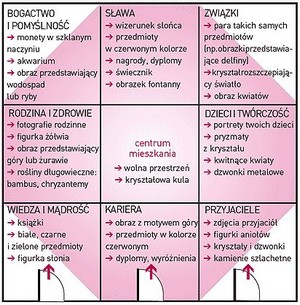 Teraz, na przykładzie pól 2 (związki i małżeństwo) i 3 (rodzina i autorytety), przedstawię kilka pomysłów, które można zastosować, by energia Chi oddziaływała na nasze dobre stosunki z rodziną. Jak już wiemy, sferze tej odpowiada żywioł ziemi, czyli remedium wspomagającym go będzie woda. W takim razie możemy w miejscu tym postawić rzeczy symbolizujące oba te żywioły. Mogą to być: fontanna, akwarium, niebieskie kwiaty, obraz wody, coś niebieskiego lub roślinny doniczkowe, drewniana ramka i coś zielonego. W żadnym wypadku nie może znajdować się tam kominek, sprzęty typu telewizor, komputer i zegar, gdyż symbolizują one metal i ogień niszczące drewno. Podobnie jest ze strefą bogactwa, gdyż odpowiadają jej te same żywioły. W strefie związków (pole 2) umieszczamy rzeczy związane z ziemią oraz jej remedium wspomagającym ogniem. Znajdować się tam mogą: kominek, świece (najlepiej czerwone) i dwie (symbol związków) czerwone róże, inne czerwone kwiaty, naturalne kryształy, lampa solna. W ten prosty sposób kierując się odpowiadającymi każdej strefie żywiołami, możemy znaleźć odpowiednie przedmioty, które pomogą nam wytworzyć dobrą energie w danym miejscu.