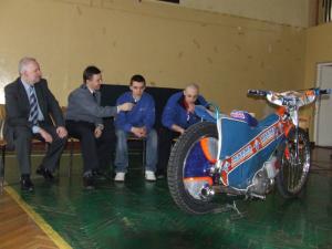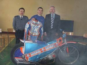 DL: Mieliśmy być tutaj w znacznie szerszym gronie, to fakt, ale niestety kilka dni temu zmarł były kierownik naszej drużyny i moi koledzy poszli dziś na jego pogrzeb, a mnie wydelegowali na spotkanie z wami. Cieszę się jednak, że tutaj przyjechałem. Jestem bardzo mile zaskoczony atmosferą panującą w waszej szkole i zainteresowaniem ze strony chłopaków moim motorem. (śmiech) Być może oczekiwaliście ode mnie czegoś więcej, ale nie mam na razie zbyt dużego doświadczenia w takich spotkaniach. Chciałbym serdecznie podziękować dyrekcji waszej szkoły i tarnobrzeskiej policji za to zaproszenie. Mam nadzieję, że jeszcze kiedyś się spotkamy.