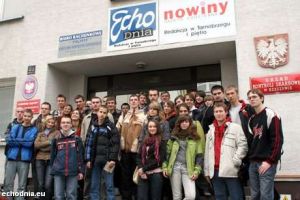 Nasza ponad trzydziestoosobowa grupa ledwo zmieściła się w jednym z pokoi redakcyjnych. Nie mniej jednak, spotkanie było bardzo przyjemne i owocne. Klaudia Tajs wraz z szefem oddziału, Marcinem Radzimowskim, wyjaśnili nam pokrótce zasady pracy dziennikarzy w lokalnej gazecie. Dowiedzieliśmy się rzeczy niezwykle istotnych dla nas, młodych dziennikarzy - amatorów. Dowiedzieliśmy się między innymi, że redakcja zaczyna dzień pracy od wyboru tematów do napisania. Ważną rolę spełniają tu informatorzy, którzy mogą dostarczyć interesujące wiadomości nawet w ostatniej chwili. Niejednokrotnie do siedziby Echa przychodzą także czytelnicy, pragnący podzielić się jakąś informacją. Redaktorzy Echa szybko piszą swoje teksty i przesyłają je do swojego wydawcy w Kielcach. Tam, po sprawdzeniu materiału i rozłożeniu go na poszczególne strony, opracowuje się gotową makietę, która jest odsyłana do drukarni, skąd jeszcze nie raz dzwoni się do dziennikarzy w celu uzyskania zgody na skrócenie bądź wydłużenie tekstów. Dlatego tak ważna w tej pracy jest dyspozycyjność, gdyż takie sytuacje zdarzają się najczęściej w późnych godzinach wieczornych.
