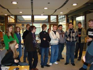 Co ważne, przestrzeń zajmowana przez pracujących jest otwarta. Nie ma, poza nielicznymi wyjątkami, zamkniętych biur czy sal. Kolejne działy informacyjne oddzielają drewniane ścianki, które mają około 1,5 m wysokości. Dzięki temu możemy bez problemu przedostać się z jednego miejsca do drugiego, niemniej początkujący dziennikarze mogą się tu z pewnością łatwo zgubić. Docieramy na najwyższe piętro – miejsce redakcji „Gazety Wyborczej” odpowiedzialnej za ogólnopolskie wydanie oraz gabinetów najważniejszych ludzi w „Agorze”. Możemy w końcu usiąść. Dziewczyny natychmiast zwracają uwagę na niebywale wygodne krzesła. Bez tego ani rusz przy wielogodzinnym pisaniu tekstów. Cały czas nasi fotoreporterzy pstrykają zdjęcia. Webmasterzy z wypiekami na twarzy i zazdrością w sercu chwalą komputery. Łyk historii „GW”, pamiątkowe zdjęcie, i powrót do sali, w której oglądaliśmy film. Po drodze zaglądamy jeszcze do redakcji „Wysokich Obcasów”. Ciemno, przy jedynym rozświetlony komputerze jasnowłosa dziewczyna stuka w klawiaturę. Oryginalna postać tego, co przeczytamy za tydzień w „WO”? Mijamy „Duży Format” – jakby nie było nikogo. Oaza spokoju w tym kipiącym kotle informacji. W salce zakładamy kurtki, dostajemy upominki. Pan Dyrektor odwdzięcza się książką z opracowaniem dziejów naszej szkoły. My cieszymy się z prezentów. Marcin, dziennikarz GW też wydaje się być uradowany. Ostatnie spojrzenie na zabieganych dziennikarzy, zagracone biurka, gołe sufity i po 2 godzinach zwiedzania jesteśmy w busie.