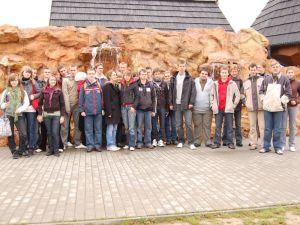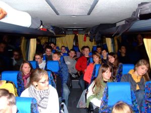 Rybosom: Dwadzieścia po siódmej - zbiórka przy tarnobrzeskiej fontannie. Mimo tak wczesnej pory, to my pierwsi zameldowaliśmy się na wyznaczonym miejscu (jeszcze przed naszymi szefami, prof. Rybą i prof. Lipcem) i szybko wsiedliśmy do busa, aby zająć jak najlepsze miejsca. Przesuwane i rozkładane fotele okazały się dla nas niezwykle pozytywnym zaskoczeniem. Takich ekstrawagancji i wygód dawno nie doświadczyliśmy. Szefowie sprawdzili obecność i wystartowaliśmy. Pędziliśmy prawie jak rakieta.