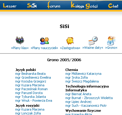 na którą składa się plan zajęć wszystkich klas i bonusowo wszystkich nauczycieli, zastępstwa i ważne daty. Ze starej wersji wypadły oceny (w sumie to co najważniejsze, ale niestety nie miał ich już kto uzupełniać) no i teraz SiSi jest ogólnodostępna. Nie wymaga już zapisywania się ani logowania, wystarczy w menu na stronie głównej wybrać „SiSi”.