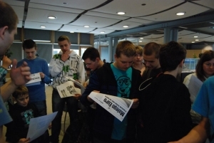 Mila: Na szczęście szybko się to zmieniło i już po chwili humor dopisywał wszystkim, a im bardziej zbliżaliśmy się w stronę Warszawy, tym robiło się cieplej. Zresztą była to chyba nie tylko sprawka słońca, ale i świetnej atmosfery jaka zapanowała w naszym busie. Tak więc do stolicy dotarliśmy zadowoleni - i nieco zgrzani (niektórzy nawet bardziej, bo musieli się nieźle namęczyć, aby skutecznie przywiązać do fotela naszego nowego redaktora naczelnego!).
