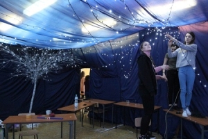Klasa C zdecydowała się na wystrój sali w klimacie zimowym. Jak się domyślacie, dominują u nich kolory biały i granatowy. Dekoracja wygląda minimalistycznie, a dopełniają ją uwielbiane chyba przez wszystkich światełka choinkowe. To, co zastaliśmy w tej sali, nie wywarło jednak na nas zbyt dużego wrażenia. Wprawdzie maturzyści z tej klasy uprzedzali nas, że brakuje tu jeszcze stołu, który ma być bardzo istotnym elementem ich pomysłu, bo nada charakteru całości, ale nie możemy brać pod uwagę czegoś, czego nie widzieliśmy. Ujęli nas jednak entuzjazmem, z jakim opowiadali o tym, co muszą tu jeszcze zrobić i jak to finalnie będzie wyglądało. Mamy nadzieję, że zdążą, a wszystko wyjdzie im tak, jak sobie zaplanowali.