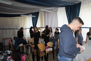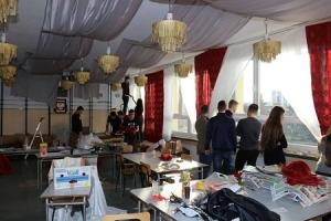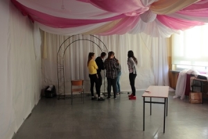 Klasa B zaproponowała naszym zdaniem wystrój typowy dla tradycyjnego polskiego wesela. U nich zaangażowanie było nie mniejsze, a od wszystkich biła pozytywna energia. Rozmowa z nimi była prawdziwą przyjemnością. Ujęła nas również ich serdeczność i gościnność, Dość powiedzieć, że już na wstępie poczęstowali nas tostami. Co prawda w wystroju postawili na klasykę, ale dodali do niej parę nietuzinkowych elementów. A poza tym u nikogo innego nie widzieliśmy tak profesjonalnego przygotowania muzycznego. W rozmowie z nami przyznali, że nie przygotowali sobie wcześniej żadnego konkretnego projektu, a ich wystrój powstaje spontanicznie. Twierdzili z przekonaniem, że taki sposób działania po prostu im odpowiada i najlepiej im wychodzi. No cóż, przyznajemy rację! Nie wyczuliśmy u nich żadnego napięcia, za to dobrą zabawę. Trzymamy kciuki za końcowy efekt!