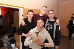 Na początek zajrzeliśmy do klasy A. Maturzyści z tej klasy przygotowywali wystrój, który przypominał komnatę zamkową z kominkiem. Co prawda nie widzieliśmy jeszcze obitych atłasem kanap i ciężkich mebli, ale poczuliśmy klimat dostojeństwa. Trudno powiedzieć, jak im się ten projekt uda doprowadzić do końca, ale zapowiada się interesująco. W odróżnieniu od wielu innych sal, u nich dominują kolory ciepłe – bordowy i złoty. Sporym zaskoczeniem dla nas była liczba osób zaangażowanych w pracę. Na pierwszy rzut oka widać było, że im wszystkim zależy na końcowym efekcie, dlatego wkładają w tę pracę aż tyle serca. Plus za pomysł.