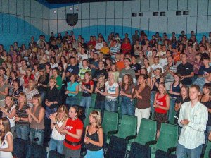 a po chwili widzieliśmy ją siedzącą na kolanach Marcina Przybysia i zasłuchaną w dźwięki piosenki płynącej ze sceny. Nauczyciele i uczniowie mieli oczywiście różne pomysły na pozbywanie się tremy. A to „kop” na szczęście (mistrzem w tej dziedziny był zdecydowanie o. Wojciech… auć.), a to parę podskoków w miejscu. Emocje, emocje i jeszcze raz emocje. Końcowa piosenka, była (zarówno podczas pierwszego jak i drugiego koncertu) naładowana nimi do granic możliwości. Wzruszenie i radość, że się udało, ulga, że jednak daliśmy radę i zwyczajne szczęście, że zrobiliśmy to razem, z wielu oczu wycisnęły łzy. Gdy opadała kurtyna, część wykonawców pozostała na scenie nie mogąc uwierzyć w to, co wydarzyło się na widowni. Uczniowie ze łzami w oczach, uśmiechami na twarzach i owacja na stojąco, to była największa nagroda za czas, poświęcenie i trud włożony w zorganizowanie koncertu. Co mówiło się za kulisami pomiędzy koncertami? „Jeszcze drugi, będzie ciekawiej.”, „Już się tak nie denerwuję.”, „To było piękne.”. A po drugim występie?... „Zróbmy trzeci koncert – będzie lepiej niż w Opolu!” (wypowiedź dotyczyła improwizacji, które podczas drugiego koncertu towarzyszyły praktycznie każdej piosence.), „Nie mam słów. Daliśmy radę!”… Nie zabrakło także pełnego ulgi „uffff”.