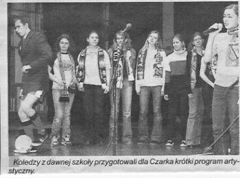 Nie zabrakło też piosenki " A mój chłopak w piłkę kopie ". Czarek Kucharski chętnie odpowiadał też na pytania nurtujące młodych "szalikowców" z Tarnobrzega. Niektórzy z nich odwiedzali już tarnobrzeski stadion, kiedy występował na nim Kucharski. Po spotkaniu przez ponad pół godziny piłkarz rozdawał zdjęcia z autografami i dedykacjami. Prezentem od uczniów była karykatura "Kucharza", wykonana przez jednego z nich. Legionista na ręce dyrektora podarował dla szkoły swoją koszulkę, w której grał na ostatnich mistrzostwach świata. Na reprezentacyjnej koszulce swoje podpisy złożyła cała kadra narodowa.