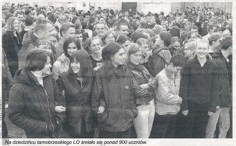 W mieście do bicia rekordu włączyły się m.in. szkoły podstawowe nr3, 9, 10, zespoły szkół nr 1 i 3. O rekordzie pamiętali uczniowie Zespołu Szkół w Nowej Dębie i szkoły podstawowej w Chmielowie. W zespole Szkół nr 3 w Tarnobrzegu, dzięki Małgorzacie Czepiel, opiekunce szkolnego koła PCK, przy okazji bicia rekordu, młodzież zebrała ponad 165 zł dla najuboższych uczniów. W Liceum Ogólnokształcącym im. Mikołaja Kopernika przed szkołą stanęło ponad 900 uczniów. Na dziedzińcu nie zabrakło transparentów z napisem "Uśmiechnij się z PCK. Śmiech to zdrowie" - Uśmiechu w szkole nigdy nie jest zbyt dużo - mówi Dariusz Bożek, dyrektor liceum. - Młodzież bardzo często śmieje się przed lekcjami, w trakcie i po. Mam tylko nadzieję, że nie z nas.