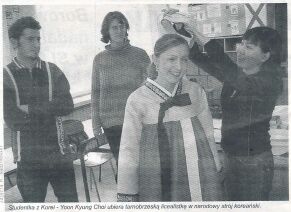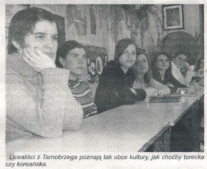 Kontakt z Międzynarodowym Stowarzyszeniem Studentów Ekonomii udało się nawiazać tarnobrzeskiemu "ogólniakowi" dzięki staraniom nauczycielek języka ang. z tej szkoły Lucyny Daniec-Zych i Renaty Brzozowskiej. - Porgram pod hasłem "Pokój i Tolerancja", ma na celu głownie uwrażliwienie młodych ludzi na obce kultury i uczenie tolerancji religijnej - wyjaśnia Lucyna Daniec-Zych. - Na całym świecie w realizacji programu bierze udział 27 studentów, z których trójke gościmy u nas. W Polsce studenci są od 7-go lutego, w Tarnobrzegu od tygodnia. Na prowadzonych przez siebie lekcjach (w języku angielskim), opowiadają młodzieży o swoich krajach, pokazują narodowe stroje, odpowiadają na wszelkie pytania dotyczące odmienności kulturowych. Yoon Kyung Choi z Koreii przyznaje, że dla niej spędzony czas w Polsce, to także czas nauki.