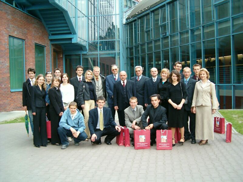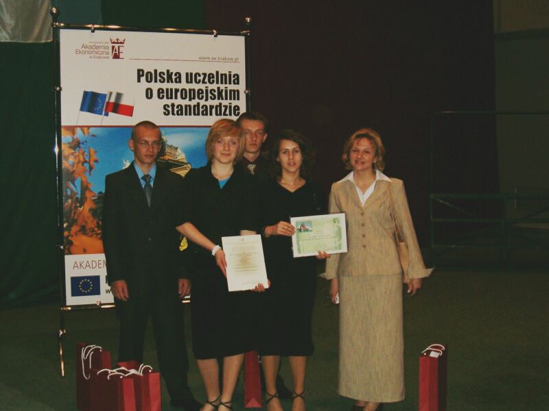 Dnia 22 marca wiele drużyn z naszej szkoły rozpoczęło zmagania w I konkursie menedżerskim w oparciu o symulacyjną grę decyzyjną TEES-6 organizowanym przez Akademie Ekonomiczną w Krakowie. Gra polegała na zarzadzaniu wirtualnym przedsiębiorstwem w warunkach niezwykle trudnej konkurencji jaką stwarzali inni uczestnicy gry. Po etapie eliminacyjnym do finału zakwalifikowały się dwie drużyny z naszej szkoły. Pierwsza w składzie Rafał Nędzi, Łukasz Siekierka, Jolanta Głowacka, Marta Satora. W skład drugiej drużyny wchodzili Leszek Papież, Barbara Gawrońska, Grzegoż Jurkiewicz, Mariusz Gołębiowski, Artur Ciejka - tegoroczni maturzyści. Jednak drużyna z drugiej klasy okazała się lepsza. W ogólnej klasyfikacji zajęła trzecie miejsce i w dniu 28.05.2004 udała się do Krakowa w celu odebrania nagrody. Wreczenie miało miejsce podczas obchodów święta Akademii Ekonomicznej w Krakowie. A to pełna lista finalistów