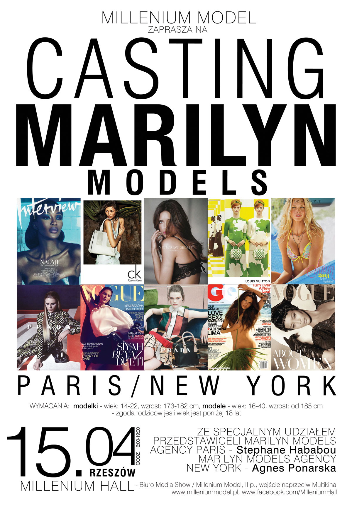 Otwarty casting w Millenium Hall będzie nie tylko prestiżowym wydarzeniem w skali Polski, ale także okazją do bezpośredniego spotkania z przedstawicielami Marilyn Agency, którzy tego dnia specjalnie przylecą na casting do Rzeszowa. Niezwykle rzadko zdarza się, że szefowie scoutingu, którzy na co dzień działają w Nowym Jorku i Paryżu, osobiście przyjeżdżają na otwarty casting do jakkolwiek innego kraju. To modelki, które mają na koncie mniejsze kontrakty są wysyłane na zamknięte castingi do Marilyn Agency.
