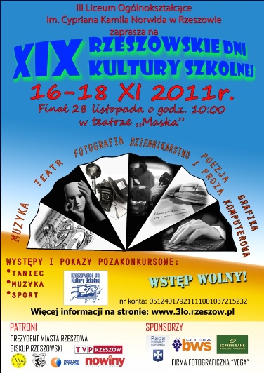 Serdecznie zapraszamy na XIX edycję Rzeszowskich Dni Kultury Szkolnej, które odbędą się w dniach 16-18 listopada 2011r. w III Liceum Ogólnokształcącym im. Cypriana Kamila Norwida w Rzeszowie.